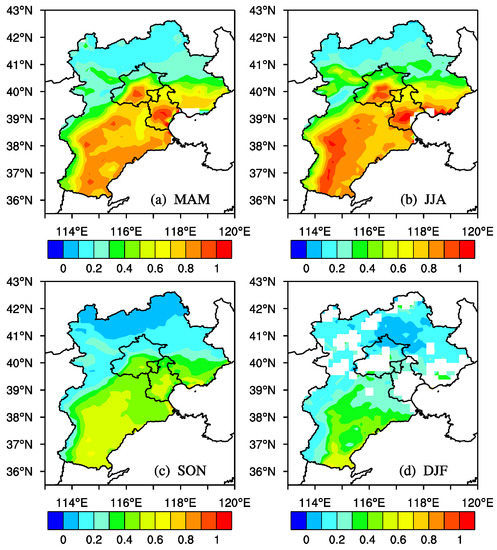 Seasonal geographical distributions of MODIS-Aqua collocated DT retrievals for the period 2006–2015 over the Beijing-Tianjin-Hebei region. The letters from (a) to (d) represent spring, summer, fall and winter in turn.