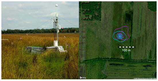 Photograph of the micrometeorological flux site in the Mittleres Wietingsmoor, NW Germany (left). Areal view (from Bing Maps) of the site with the overlaid daytime (light blue) and nighttime (purple) flux footprint during the experimental period (see Section 2.3 for more details) (right). Contour lines correspond to the 20%, 40%, 60% and 80% contributions to the flux footprints calculated according to Kljun et al. [].