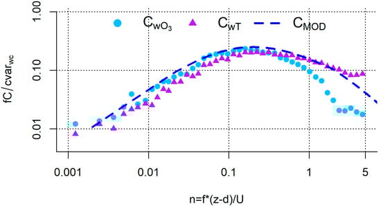 Ensemble co-spectra of the vertical wind component w with ( blue circles) and with T (w’T’, purple triangles). The co-spectral model for w’T’ after Kaimal and Finnigan [] is shown as a blue dashed line. The normalized frequency of 1 corresponds to a real frequency of 0.5 Hz.