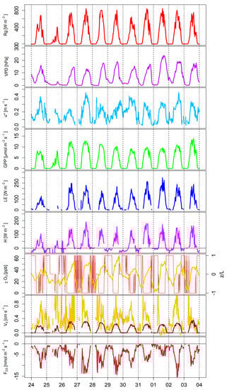An eleven-day time series of selected meteorological, ecosystem flux, and ozone data is shown in Figure 3. Clear diurnal cycles are evident for all depicted parameters. The solar radiation (top panel) indicates that most days were partly cloudy. Tair reached maxima between 20.7 °C and 28.4 °C, while the minima were between 12.0 °C and 18.0 °C. The VPD (second panel) was low during most of the nights and had a maximum of 23.8 hPa on 1 August at 16:30 h. The diurnal cycle of u*, with mostly very low values during the nights and moderate values during the days, indicates a diurnal cycle of turbulence intensity and wind pattern. The boundary layer was stable during the nights (positive z/L, third panel from below) and unstable during the days (negative z/L). The diurnal cycles of GPP, LE, and H (panels 4–6 from top in Figure 3) were typical expressions of a hot, mostly sunny, and relatively calm high-pressure summer period in central Europe. Intense upwelling fluxes of long-wave radiation led to negative radiation balances during the nights (both not shown in detail) and to negative, downward fluxes of H.
