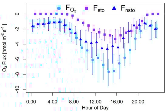 Ozone deposition flux () partitioning between stomatal () and non-stomatal () contributions. Medians and interquartile ranges are shown for each 1-h interval of the day.