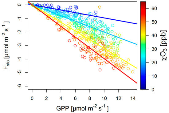 The partitioning of into and allows us to disentangle different processes driving . Figure 5 shows a plot of the stomatal flux versus GPP with used to color-code individual data points. As GPP and are the main drivers of , a dependence of the slopes of regressions for various classes is to be expected in this plot. The larger is, the larger (with larger negative numbers) is. However, there remains a scatter in Figure 5 due to the fact that it is not the ambient ozone concentration that is used to compute but the surface ozone concentration (Equation (7)). This surface concentration is computed for each half hour and it introduces the variability in the computation of from measured data.
