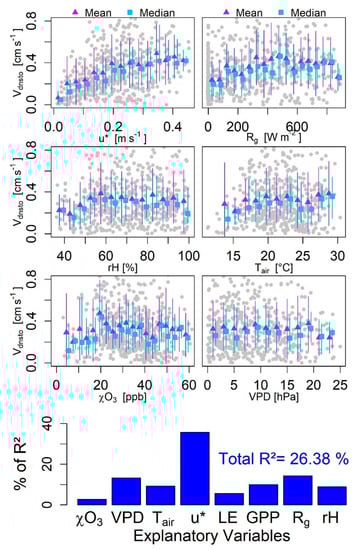 Top panels: Relationships between (y-axes) and u*, Rg, rH, Tair, and VPD shown as grey full circles. Purple triangles are means ± standard deviations; light blue squares are medians with 25th and 75th percentiles. Bottom panel: Relative importance analysis of the drivers of ; bars indicate the percentage that each variable contributes to the total R2 of all variables.