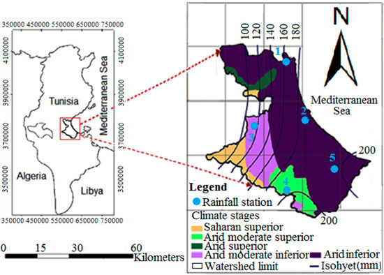 We collected precipitation data at 5 rainfall stations in the Watershed on a monthly scale from 1977 to 2015. These reference stations are homogeneously distributed and represent the different zones in the study basin (Figure 1). We obtained precipitation data from the Tunisian Ministry of Agriculture and Water Resources [27]. Most study stations are coastal with altitudes not exceeding 100 m. Station 4 is the exception (441 m.a.s.l). This station lies in the mountainous zone of Matmata in the south of the study area. Rainfall data sets firstly underwent the test of Mann-Kendall. It was for randomness, homogeneity and absence of trends. All five selected stations passed the test with a rate of 95% as confidence interval.