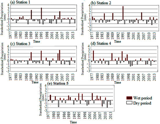 The third period (2002–2015) was distinguished with an increase of wet years and more frequent dry years compared to the first period. Stations 4 and 5 showed some difference, especially until around 2004. Standardized precipitation ratio presented negative and positive values varying from −1.95 to 2.91