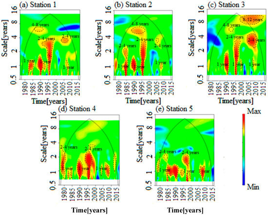 Extensive high energy areas in the spectrum were depicted. Figure 5, Figure 6, Figure 7, Figure 8 and Figure 9 show large inter-annual and annual coherence scales. The most important oscillations per each station were studied. Interestingly, inter-annual coherence was essentially detected in energy bands (2–4, 4–8 and 8–12 years). For station 1, in the 2–4 year band, significant energy was visible between 1977 and 1983 and between 1993 and 2000 for MO and between 1990 and 1995 for WeMO. However, the 4–8 year band was observed from1985 to 1995 for AO and between 1995 and 2000 for MO. Thus, MO, AO and WeMO were detected as most important oscillations. For station 2, strong coherence was observed for the 8–12 year band for 1995–2010 WeMO and PDO indices. For 4–8 years, high energy was observed between 1990 and 1995 for MO, 1985–2000 for PDO, AO and WeMO, and between 2000 and 2005 for WeMO. The band 2–4 years was detected between 1995 and 2000 for SOI, AO, between 1990 and 2000 for PDO and between 2005 and 2010 for WeMO. Consequently, MO, AO, PDO and WeMO were the most frequent oscillations. Station 3 was an exception and had the most dominant climate indices. The band 2–4 years was affected between 1995 and 2000 by SOI and PNA. The 4–8 years was detected between 1985–1997 for SOI, AO and PDO, 1993–2000 for MO; 2000–2005 for WeMO, and 1990–1995 for PNA. The 8–12 years was observed between 2000 and 2015 for PNA and PDO, between 1977–1998 for MO and 1995–2000 for WeMO. Thus, WeMO, MO, AO, PDO, SOI, PNA, AMO were most frequent oscillations in station 3. For station 4, WeMO, AO, SOI and AMO were the most frequent indices. For 2–4 years, AMO, SOI, PNA were detected between 1995 and 2000. For 4–8 years, 1985–1995 were most important for AO and 1995–2000 for AMO and 1995–2008 for WeMO. The 8–12 years was observed except on PDO between 2000 and 2010 and WeMO between 1995 and 2005. For station 5, WeMO, MO, AO, SOI, and AMO were selected as dominant indices. For 8–12 years, MO was the most prevailing during the whole investigation period and WeMO from 1990 to 2008. The 4–8 years revealed the period 1995–2000 the most significant for AMO, 1985–1995 for AO and PDO and 2010–2015 for AO. For 2–4 years band, the 1980–1985–1990 periods were significant for AMO, and around 1990 for AMO, SOI, and AO.