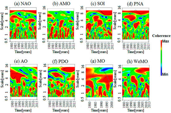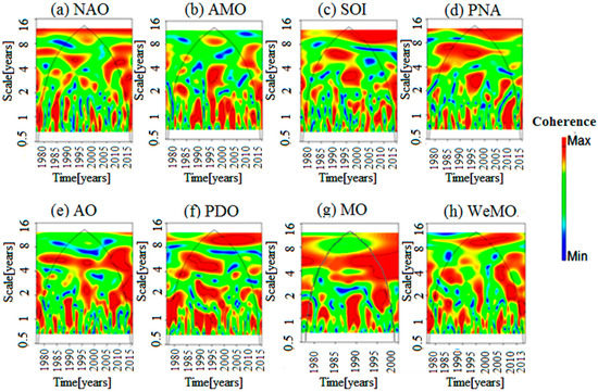 Spectrum of Wavelet coherence for climate indices and precipitation in station 1. (a) NAO: North Atlantic Oscillation, (b) AMO: Atlantic Multidecadal Oscillation, (c) SOI: Southern Oscillation Index, (d) PNA: Pacific–North-America teleconnection, (e) AO: Arctic Oscillation, (f) PDO: Pacific Decadal Oscillation, (g) MO: Mediterranean Oscillation, (h) WeMO: West Mediterranean Oscillation.