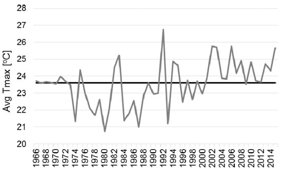 The average summer season (June–August) Tmax in the years 1966–2015 was 23.6 °C and ranged from 20.8 °C (1980) to 26.8 °C (1992) (Figure 2). The standard deviation for the given multiannual period was 1.4 °C. A statistically significant (p < 0.05) increase in Tmax was observed in the period analysed, which was 0.35 °C per 10 years. The aforementioned increase was significantly influenced by Tmax changes at the beginning of the 21st century, when its value in almost all summer seasons was higher than the average for the 1966–2015 period (Figure 2). In the 1966–2000 period, during 19 of the 35 summer seasons, the Tmax mean was lower than the mean from the multiannual period.