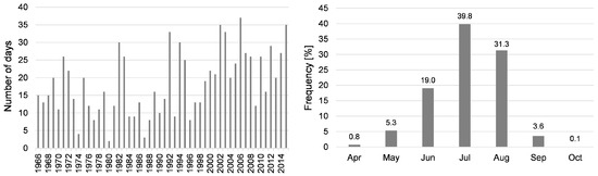 Number of hot days in 1966–2015 and the frequency of hot days’ occurrence in certain months.