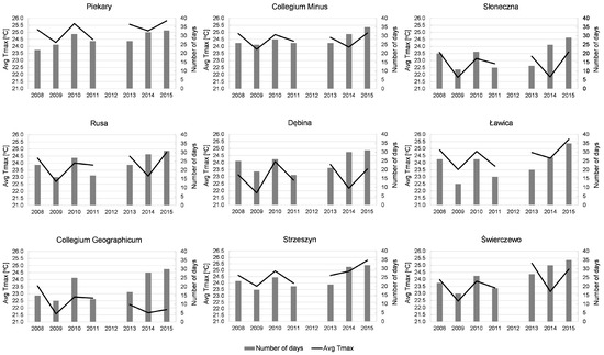 In 2008–2015, the average Tmax in the city area was 23.8 °C and changed from 22.3 °C in Collegium Geographicum to 25.1 °C in Piekary. At all points, the coldest season was recorded in 2009. The average Tmax then changed from 21.6 °C in the Collegium Geographicum to 24.3 °C in Piekary (Figure 4). Also, at the two points (Collegium Geographicum and Słoneczna), the same average Tmax as in the summer of 2009 was recorded in the 2014 season. On the other hand, at most points, the highest mean Tmax in the summer occurred in 2015 and ranged from 21.9 °C at the Collegium Geographicum up to 25.8 °C in Strzeszyn and Piekary.