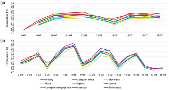 The heatwave lasted from 8–17 July 2010. On 8 July, it started in Collegium Minus and Piekary, while for the rest of the area it was on 9 July. Mean Tmax during the wave ranged from 32.5 °C in Collegium Geographicum and Ławica to 33.7 °C in Dębina. At most points, the highest Tmax was found on 12 July and fluctuated from 33.1 °C at Słoneczna to 35.4 °C in Collegium Minus (Figure 5a). During the heat wave there was a marked cooling on 14 July, caused by the passage of a warm weather front. Then Tmax changed from 30.1 °C at Słoneczna to 32.9 °C in Collegium Minus.