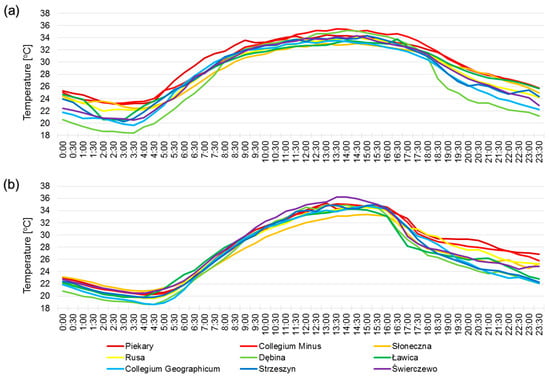 Daily course of air temperature in Poznań on 12 July 2010 (a) and 11 August 2015 (b).