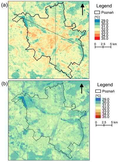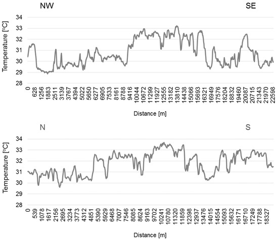 A significant decrease in the air temperature is observed in forest areas in the eastern part of Poznań, forming the eastern green wedge. In turn, along the profile made along the north–south line (about 19 km length), the air temperature changed from 29.6 °C to 33.7 °C (Figure 9). The coldest areas were found in the northern part of the city, where farmland dominates. A significant increase in air temperature (>32.0 °C) was found in areas with low-density, compact urban development occurring in the Naramowice, Winogrady, Stare Miasto and Wilda housing estates. A clear drop in air temperature was recorded in the Warta River Valley.