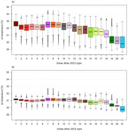 Statistic of air temperature in Poznań ((a)—12 July 2010, (b)—11 August 2015) on the basis of Landsat images according to Urban Atlas 2012 types (colours and order of types according to legend in Figure 1). In the boxplot, the middle values denote medians; the box extends to the Q1 (first quartile) and Q3 (third quartile), while the whiskers show the range (99.3%). The upper whisker shows Q3 + 1.5 × IQR (the interquartile range) and the lower shows Q1 − 1.5 × IQR. The notches extend to +/−1.58 IQR/sqrt(n) and the dots represent outliers.