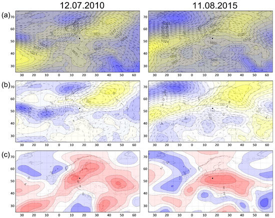 SLP and z500 hPa (a), SLP and z500 hPa anomalies (b) and T850 anomalies (c) on 12 July 2010 (right column) and 11 August 2015 (left column).
