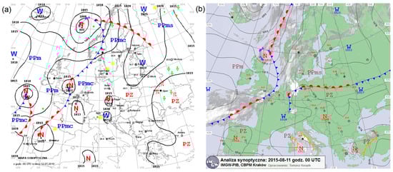 Weather situation on 12 July 2010 (a) and 11 August 2015 (b). Source: Meteorology and Water Management–National Research Institute.