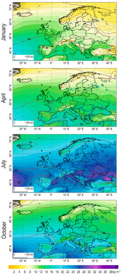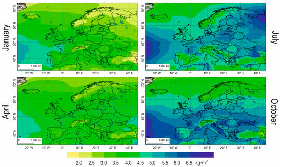Year-to-year variability was also examined based on standard deviations for TCWV values. In winter (January) the largest absolute differences occurred over the southern part of the European Atlantic (4.5–5.0 kg·m−2), reaching east toward the western coast of the Iberian Peninsula, while the smallest were noted at higher altitudes (<2.0 kg·m−2). Significant year-to-year variability in the summer was noted in the interior of the European continent and across areas of ocean (>6.5 kg·m−2). On the other hand, a fairly even distribution of moisture content is characteristic of high latitudes and the Mediterranean Sea, where changes in TCWV stand at less than 4.5 kg·m−2. April was the month with the smallest spatial changes in the study period. The standard deviation (SD) of TCWV in the spring (April) for the entire study area ranged from 3.5 to 4.5 kg·m−2, a much smaller range than that for autumn. For October, SD values ranged from more than 6 kg·m−2 over the Atlantic to about 4 kg·m−2 beyond the Arctic Circle. Outside of mountain areas, TCWV fluctuations clearly follow a zonal pattern (Figure 2).