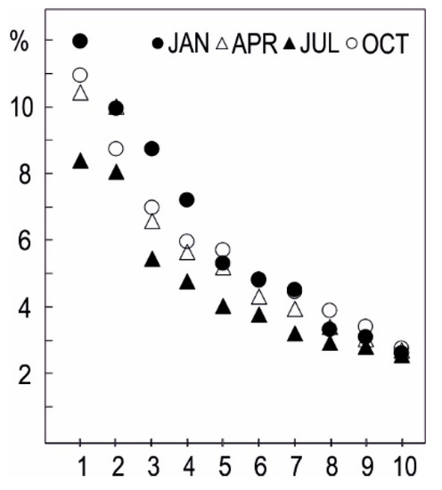 EOF analysis was employed for each month separately in order to supplement the analysis of TCWV (spatial patterns and fluctuations) for all of Europe. The amount of total variance was explained via each subsequent mode for selected months (Figure 3), which shows just how much water vapor content in air varies across a given geographic area. The first 10 modes explain an average of 60% of total variance in January and October, 56% in April, and merely 46% in July. The share of individual modes strongly suggests that only the first two modes serve as the most important TCWV patterns (Figure 3). This is true for all the studied months except January, when the first four modes are characterized by a decreasing but still important amount of variance (Figure 3).