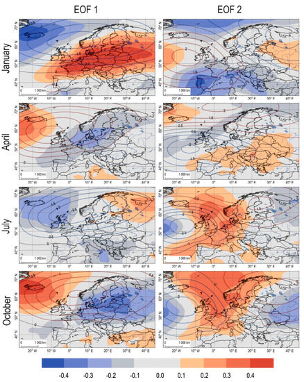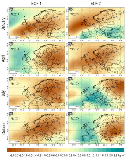 The advection of warm air heated over land surfaces leads to positive anomalies in moisture content. In the transitional months of the year (April, October), the strength of the dependence is much lower than in January and July—the coefficient of correlation exceeded 0.1 or equaled less than −0.1 (statistically significant at α = 0.05) only in selected geographic areas. The EOF 1 for both months was manifested via an extensive center of positive anomalies in the north of the study area. This spatial pattern generated statistically significant relationships with TCWV in Central and Northern Europe and over the North Atlantic. EOF 2 modes mirrored patterns for the preceding season of the year—i.e., July pattern in October and January pattern in July (Figure 7).