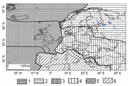 Cluster analysis performed in this study helped identify the following six regions: Northern—Atlantic (NA—1), Northern—Continental (NC—2), Mid—Atlantic (MA—3), Mid—Continental (MC—4), Subtropical—Atlantic (SA—5), and Mediterranean (Med—6) (Figure 5, Table 1).