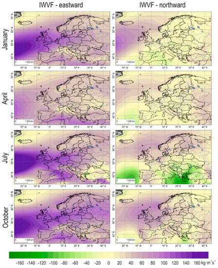 Spatial differentiation in vertically integrated water vapor eastward (i.e., zonal) and northward (i.e., meridional) flux (Figure 6) confirms the strong significance of zonal circulation carrying air masses saturated with moisture from over the ocean across the European subcontinent—first and foremost across Western Europe and the Atlantic coast of the Scandinavian Peninsula (high positive eastward flux values). A study by Lavers and Villarini [3] also confirms this finding. Zonal flux is most difficult to discern in the spring (April), which is also characterized by little differentiation in moisture conditions (cf. Figure 1, Figure 2 and Figure 4).