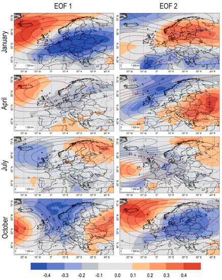 In addition, spatial differentiation in January (Figure 4) shows that in the case of EOF 1, main anomalies are located over the Bay of Biscay (negative anomalies) and near Iceland (positive anomalies), while for EOF 2, the largest anomalies occur over the British Isles and the largest negative anomalies occur over southern Europe (Figure 4).
