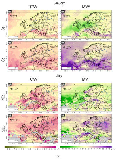 Advection types from the south (Sa, Sc) were selected for January in order to show contrast. It was easy to observe the “drying” effect of the seasonal pressure high over land areas along with the orographic barrier produced by the Alps (Sa). The largest positive anomalies in TCWV and IWVF occurred in the Mediterranean region, while the largest negative anomalies occurred in Central and Western Europe. Cyclones [34] helped facilitate the mobility of water vapor (Sc). The spatial differentiation of anomalies in both variables was much smaller. The advection of warm air from the south containing a relatively high amount of moisture was an additional driver of positive anomalies across most of the study area, except for areas in the shadow of an orographic barrier (Figure 9a). The situation with the largest positive anomalies in the study area (TCWV and IWVF) was January Sc, which was also characterized by the highest frequency of the occurrence of TCWV extremes whose relative humidity for a given air mass exceeded 80%.
