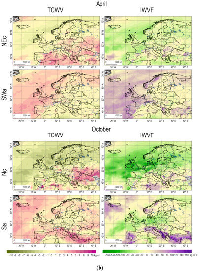 The magnitudes of TCWV and IWVF anomalies for different types of advection were analyzed in the study. Anomalies were defined with regard to monthly means of TCWV and IWVF (1981–2015) to emphasize the modifying effect of advection directions. Figure 9a,b show only selected situations characterized by the largest spatial differentiation or strong regional significance.