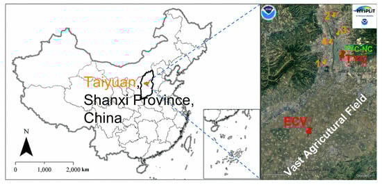 Taiyuan, a typical city of heavy reliance on coal as a primary source of heat and power, is located in North China with a population of approximately 4.2 million. Its rural and urban land areas are respectively ~5500 km2 and ~1500 km2, and the terrain resembles a bowl surrounded by hills in its west, north, and east directions [,]. The southern plain of Taiyuan is a vast agricultural field where corn and wheat are mainly planted. The heating period in the urban region is usually five months (from November to March), while the raw-coal (even peat) burning in rural areas routinely lasts more than six months for heating and almost the whole year for cooking.