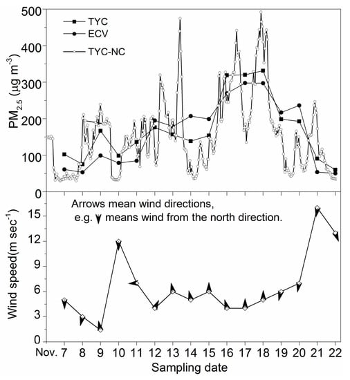 The concentration variation of PM2.5 and wind speeds and directions during the sampling period.