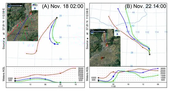 The 24-h backward air-mass trajectories in the peak haze stage (A) and in the normal stage (B).