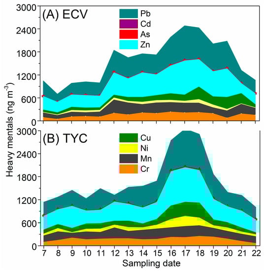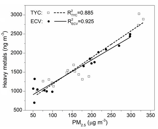 The daily variation of heavy metals in PM2.5 at the ECV and TYC during the sampling period is illustrated in Figure 4. It is evident that the concentrations of the heavy metals in PM2.5 also varied greatly during the sampling period. Comparing Figure 4 to Figure 2, the temporal variation of heavy metals was similar to that of PM2.5 with correlation coefficients (R2) of 0.925 at the rural site and 0.885 at the urban site (Figure 5), respectively, indicating that the concentration of heavy metals in PM2.5 measured could be used as an indicator of the pollution level in the rural and urban areas.