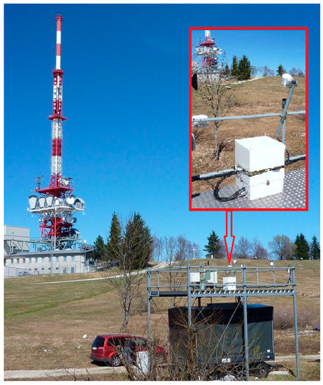Gaisberg Tower and the X-ray measurement system are shown in the picture. In addition to the X-ray detector (also shown in the zoomed-in box), vertical fast E-field antenna, the field mill, and other meteorological instruments are located on the roof of the structure shown. The EMC cabinet containing the measuring equipment is also visible inside the structure. The shunts, measuring the current, are located at the tower top.