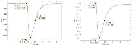 The energy of an X-ray event (single or multi-photon) was estimated by simply multiplying the peak voltage of each corresponding X-ray pulse by the calibration factor. It is important to mention that because of the limited 10 Mhz bandwidth of the fibre-optic links, the rise-time of NaI(Tl) detectors is prolonged. The response of such a detector setup to a multi-photon pile-up could be indistinguishable from a single photon response. Our experience of NaI(Tl) detector response in the laboratory [22,23], and other independent laboratory experiments using even much faster LaBr3 detectors [24] confirm that scintillator response for multi-photon pile-ups is difficult to detect just by observing detector response. Because of these reasons, energy obtained in this study from waveforms could be over-estimated. A calibration waveform (a single-photon event) and the detector response to a laboratory discharge (a multi-photon event) are shown in Figure 2.