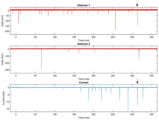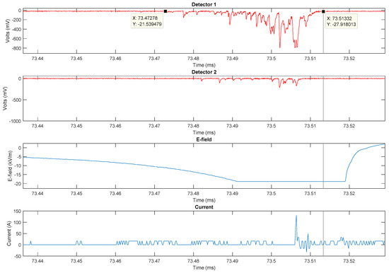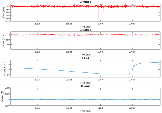 These total 85 flashes recorded contained a total of 389 pulses or strokes (ICC pulses, RSs, and M-component pulses). The 19 flashes with RSs (all negative) contained a total of 79 RS pulses. There were no X-ray detections associated with any of these ICC pulses, RS pulses or M-component pulses (i.e., X-ray peaks within about a hundred microseconds before a pulse). It is important to mention that, as also described previously (Section 2. Experiment), the signal-to-noise ratio of the X-ray detector system during phase 1 was such that, only X-ray peaks higher than 60 keV could be successfully detected. The classification of the type of flashes, strokes, and current pulses used above is discussed in more detail in [25,26].