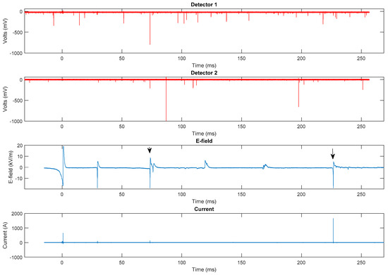 Full X-ray record of the flash containing the strokes shown in Figure 2 and Figure 3. The time t = 0 corresponds to 16:09:36.072213 UTC. X-rays were recorded with a 300-ms time window. The RSs described in Figure 2 and Figure 3 are indicated by the two arrows in the E-field waveform. Two more subsequent RSs occurred later in time are not captured.