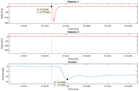 X-rays from a subsequent stroke of another flash occurred on 01 April, 2015. Time (ms) starting from 01:23:27.482779 UTC is given in the x-axis. The occurrence of the X-ray is about 2.2 µs prior to the onset of the current peak of the third and last RS. Flash contained two ICC pulses before the RSs. Two X-ray peaks are visible in the un-attenuated detector. The time of occurrence of the X-ray pulse is marked by the black vertical cursor. Because of the limited bandwidth of the fibre-optic link, the shape of this very small peak could be distorted. The vertical cursor is fixed at the X-ray peak. Peak energy is around 60 keV (calculated by multiplying the peak voltage by the calibration factor). The timestamp of the RS is 01:23:27.769214 UTC.