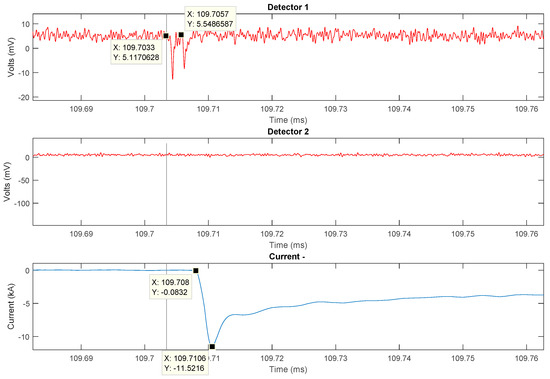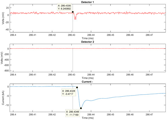 X-ray burst associated with the third (second subsequent) return stroke. The time t = 0 corresponds to 16:09:36.072213 UTC. X-rays are detected in both attenuated (detector 2) and unattenuated (detector 1) detectors. According to the Austrian Lightning Detection and Information System (ALDIS), this 36-kA stroke occurred at a distance of 400 m from the tower. Peak energy of the burst, derived from roughly −800 mV peak in the un-attenuated detector, is about 4.3 MeV (this could be due to a multi-photon accumulation). The two cursor positions indicate the first and the last occurrence of X-ray peaks. This last occurrence, also shown in the black vertical cursor, happens roughly 1.4 µs before the return stroke (RS) time of 16:09:36.145867 UTC as recorded by the ALDIS. The total duration of bursts is about 40 µs. The seemingly continuous nature of bursts (in detector 1) could be resulting from the slow detector response. The small current peak of about 125 A (measured at the top of Gaisberg radio transmission tower (GBT)) could be due to an unconnected leader.