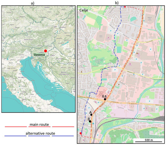 (a) Location of Slovenia and Celje (marked with red dot). (b) Map of Celje with the highway and main roads (basemap source: © OpenStreetMap). Measurement sites: A—urban background and traffic sites: intersection K4 and site B. Dashed lines represent the existing main (red) and alternative (blue) cycling routes.