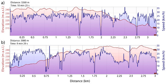 Elevation (red) and speed (blue) graphs for the existing main (a) and alternative (b) cycling route [25]. Note the opposite cycling direction, marked by the opposite elevation gradient.