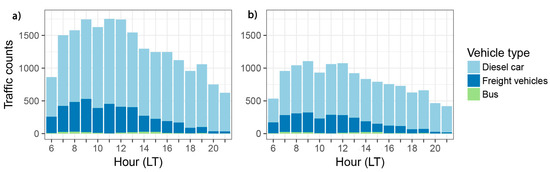 Distribution of traffic flow for diesel vehicles at measuring points: (a) intersection K4 and (b) site B.