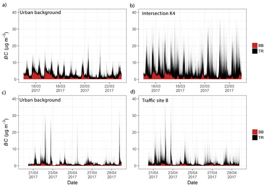 Time variation of black carbon (BC) concentration apportioned to traffic (TR) and biomass burning (BB) during two measurement campaigns in March 2017 (a,b) and in April 2017 (c,d), measured simultaneously at the background location—A (a,c) and close to the street intersection K4 (b) and traffic site B (d).