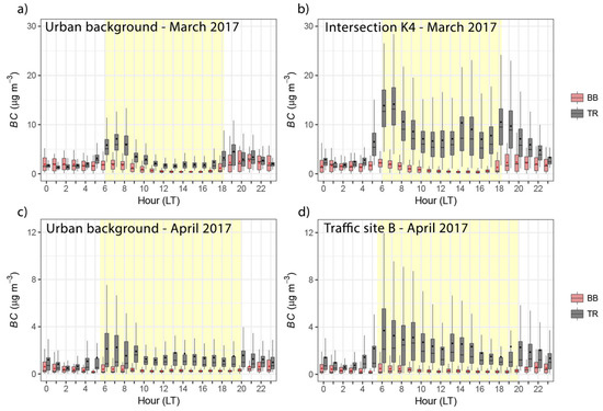 Diurnal variation (working days) of traffic (TR) and biomass burning (BB) BC concentration at the urban background location (a,c), and at traffic sites: intersection K4 (b) and site B (d) during measurement campaign in March and April 2017. Averages (1 h) are presented as box plots (box: range between 25th and 75th percentile, central line: median, dot: mean, upper and lower whiskers represent data within 1.5 × IQR (inter-quartile range) distance). Daylight duration in the period of measurements is highlighted in yellow. Time is presented in local time (LT). Note the different scales in March and April.