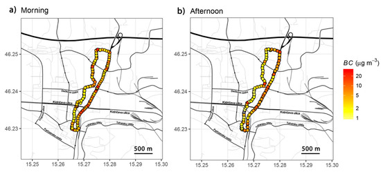 Mobile measurements of BC concentration following the main and alternative cycling route (Figure 1) during the morning traffic rush hour (a) and in the afternoon (b). BC concentration is presented in color scale (logarithmic).