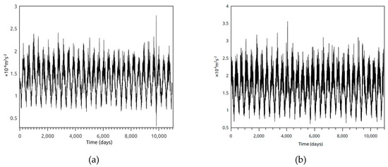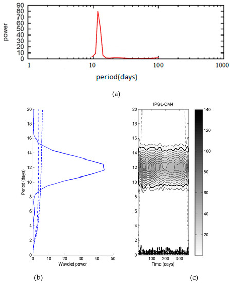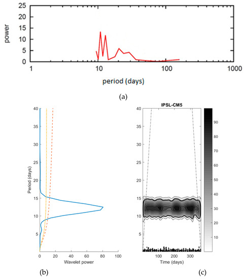 In order to calculate the spectral characteristics of the daily IE field, obtained from the Northern Hemisphere 500 hPa heights for the years 2020–2050 from both versions of the IPSL model, a Fast Fourier Transform (FFT) was applied to the daily IE time series. A bandpass filter with was employed to isolate periods of approximately 5–40 days in the IE time series, which correspond to the general time-scale of planetary-scale flows. Additionally, [38] and references therein demonstrate that the planetary scale using spatial filtering techniques corresponds to low wave numbers, up to four or five, which have a time-scale of about six days as inferred from [39,40] or others. For the wavelet analysis, the Morlet wavelet was used as the wave basis, and this has been used in published climatological studies [41,42,43]. The data were smoothed, using a moving average to remove seasonality, and the linear trend was subtracted before obtaining the power spectrum. The spectral density was calculated at the 95% confidence level. IE was also calculated from the set of Northern Hemisphere re-analyses, as well for comparison to the model output. The 500 hPa heights were obtained from the National Centers for Environmental Prediction/National Center for Atmospheric Research (NCEP/NCAR) re-analyses, which were archived on a 2.5° × 2.5° latitude/longitude grid from 1981 to 2010.