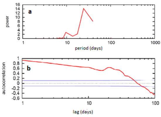 The control model run (IPSL-CM5) for (a) IE band passed (5–40 day) FFT power spectra (ordinate) versus spectral period (days—abscissa) (top), and (b) the autocorrelation of the IE diagnostic (ordinate), where the lag is presented in days (abscissa). The blue dashed line is the zero correlation line, and the solid line is the 95% confidence level.