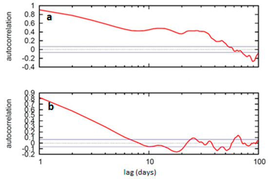 The autocorrelation of the IE diagnostic (ordinate), where the lag is presented in days (abscissa) for (a) the representative concentration pathway (RCP) 4.5 IPSL-CM4 (top), and (b) the RCP 4.5 IPSL-CM5 (bottom).