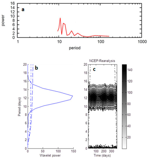 The Integrated Regional Enstrophy (IE) (× 10−6 m2s−2—ordinate) diagnostic derived from the Northern Hemisphere 500 hPa heights for the (a) band passed (5–40 day) Fast Fourier Transform (FFT) power spectra (ordinate) versus spectral period (days—abscissa) (top), and (b), and (c) the wavelet power spectra (time period is days) (bottom). In (b) and (c) the dashed lines represent statistical significance at 90 and 95%, and regions where edge effects become important [47], respectively. Only peaks with statistically significant power are shown in (c).