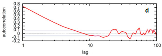 The autocorrelation (see Figure 5a) of the IPSL-CM4 RCP 4.5 time series decays rapidly, but there is a “bump” at a lag correlation of approximately 10 days, as suggested by the spectral peak in Figure 2a. In Figure 3, the power spectrum for the IPSL-CM5 time series of the IE has a spectral peak at approximately 10–12 days, as shown above, but also has peaks beyond the 10-day period (around 20–30 days) that were not captured as strongly in the IPSL-CM4 time series of the IE. However, the autocorrelation in the time series for both versions of the IPSL model (Figure 5) are qualitatively similar. The autocorrelation of the control model simulation, as represented by IPSL-CM4 (Figure 4b), is also consistent with the RCP 4.5 IPSL-CM4 and CM5 model (Figure 5).