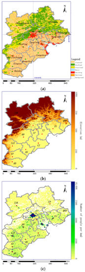 Beijing-Tianjin-Hebei land-use data in 2010 (a), a digital elevation model (DEM) of the study area (b), and the population distribution in 2010 (c) The 1 km × 1 km land-use data and population statistics were obtained from Global Change Research Data Publishing & Repository, and the DEM data with a resolution of 90 m × 90 m employed in this study was acquired by the NASA Shuttle Radar Topography Mission (SRTM).